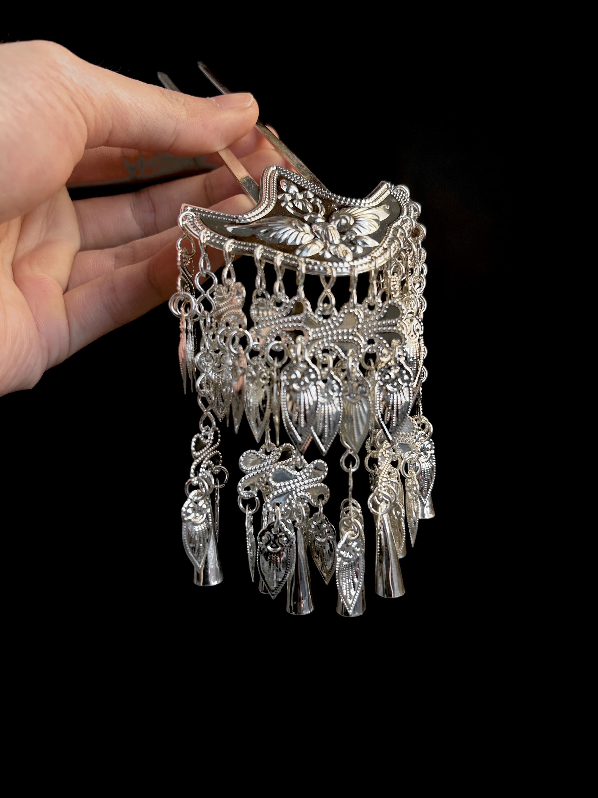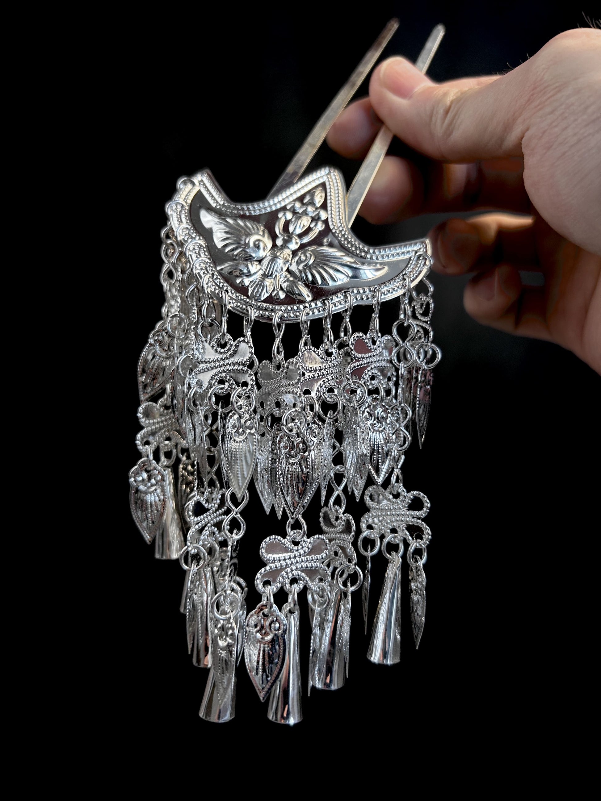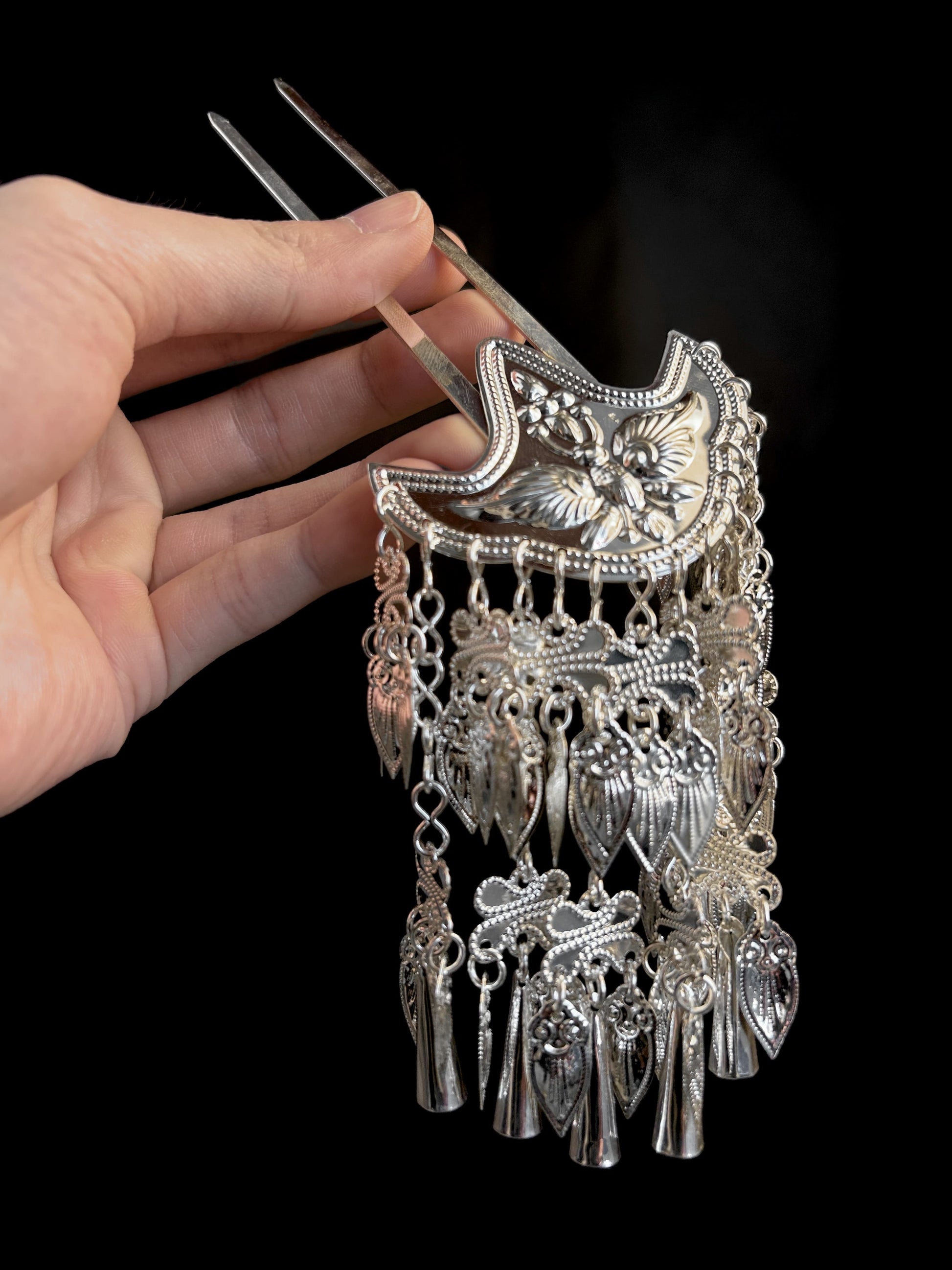 This hairpin draws inspiration from the gentle curve of a silkworm cocoon and the flowing beauty of leaves, combining a sculpted cocoon base with delicately layered metal foliage. Each leaf is crafted with fine texture and graceful movement, capturing the elegance of nature and traditional craftsmanship. Designed to secure hairstyles with subtle sophistication, it brings a whisper of organic poetry and ceremonial charm to everyday wear.