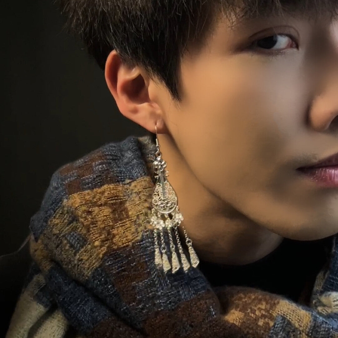 Inspired by the elegance of imperial music and costume, these earrings feature a finely detailed pipa (Chinese lute) silhouette, adorned with intricate metalwork and cascading metallic tassels that sway with a soft, rhythmic chime. Rich in texture and opulent in presence, they capture the grandeur of palace aesthetics—a wearable performance of historical romance and dramatic beauty, designed for moments that call for ornate expression.
