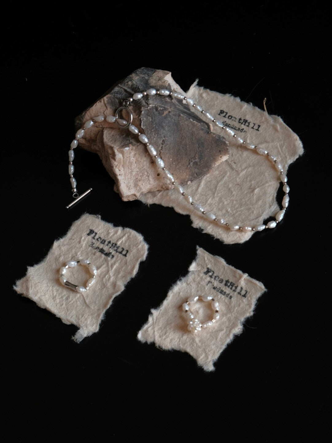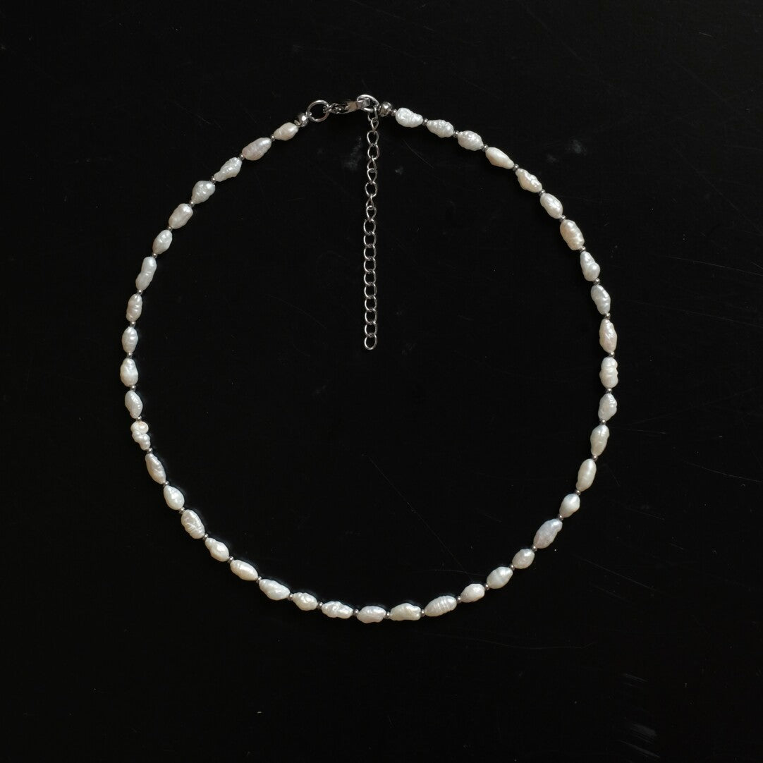 Inspired by the soft drift of light in water, this understated necklace features delicate baroque pearls interspersed with smooth minimalist beads, strung on a fine, adjustable chain. Its lightweight design allows for effortless layering, creating a personalized cascade of organic glow and clean lines. A subtle yet expressive piece—wear one strand for quiet elegance, or stack multiple for a fluid, dreamlike statement.