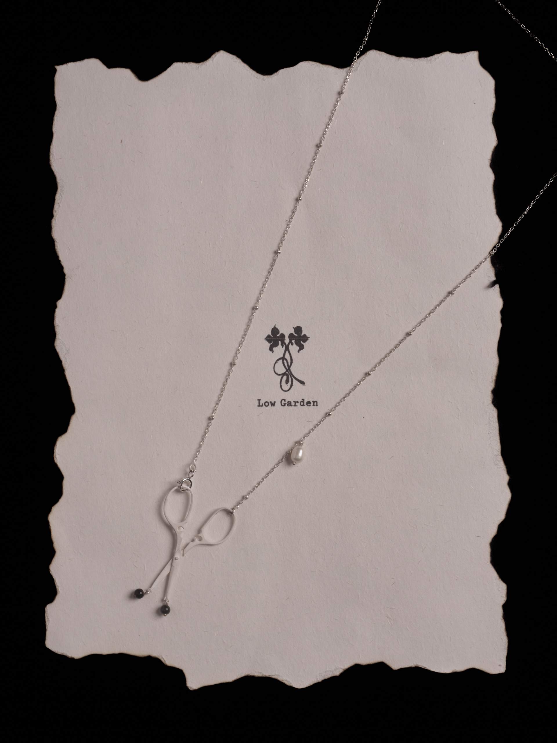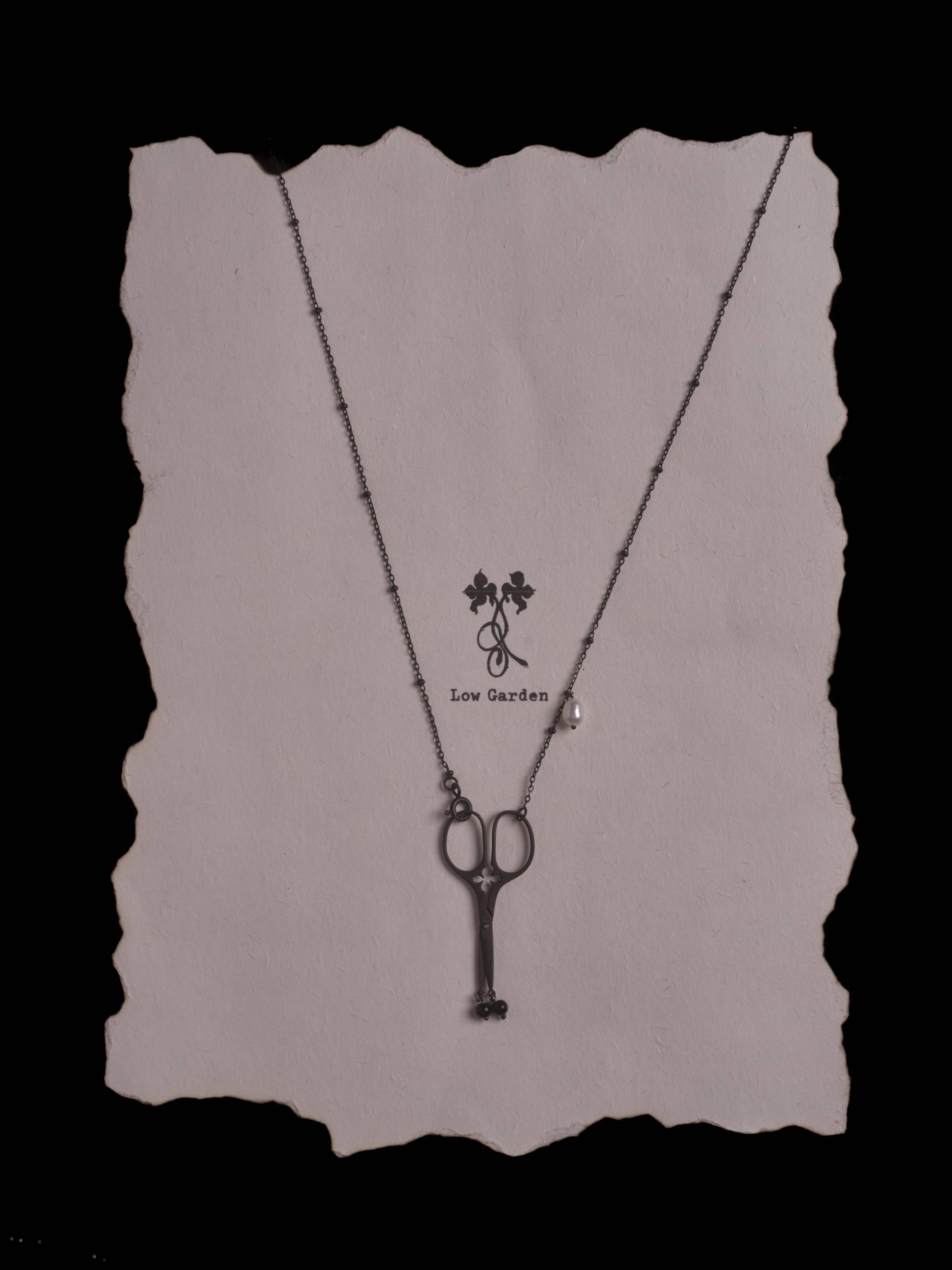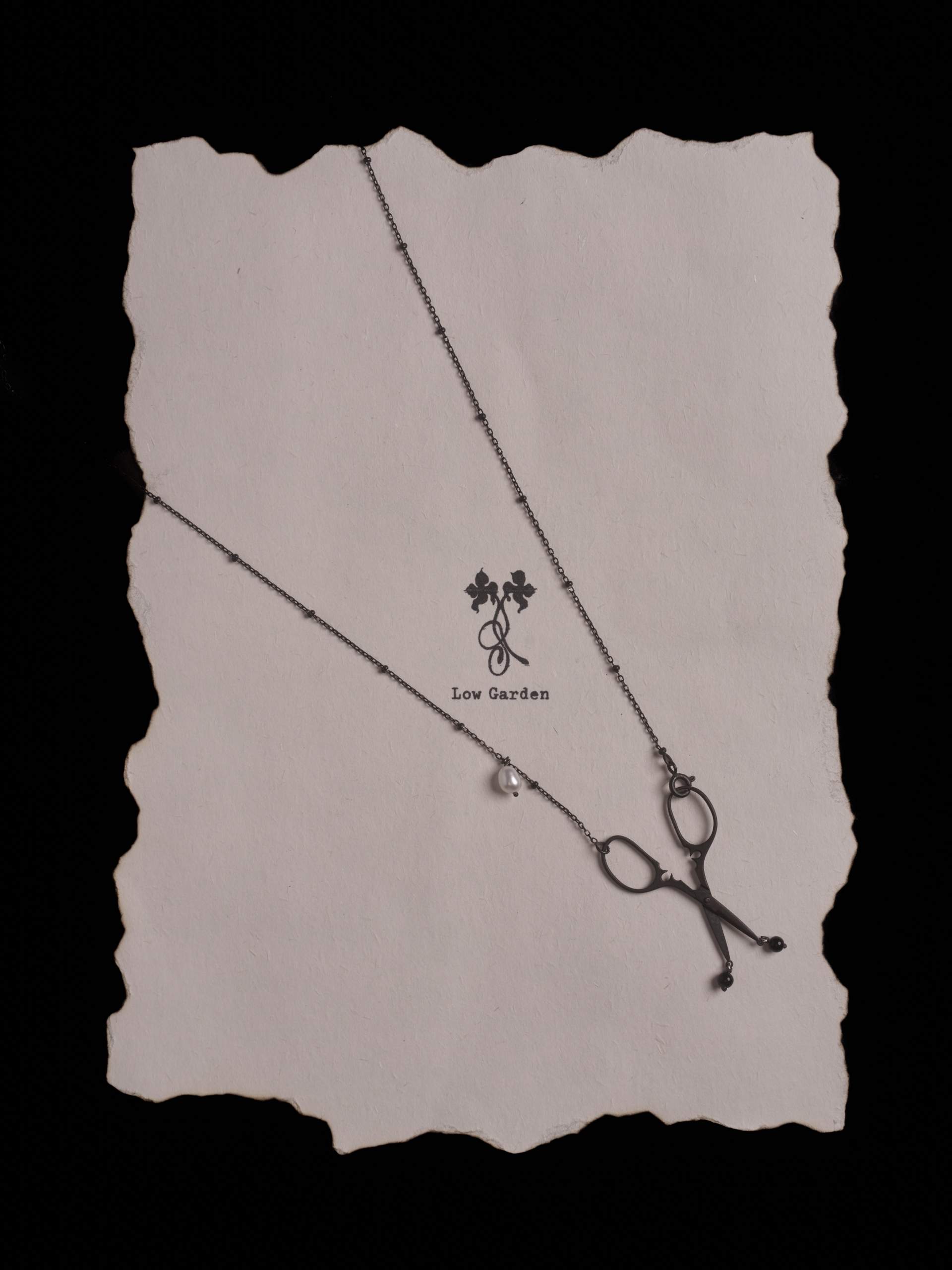 Four-Leaf Clover Scissors Obsidian Pearl Necklace features a striking contrast between luminous pearls and antique-finished blackened silver, creating a look that feels both elegant and unconventional. The sculptural scissors motif adds a poetic, artistic edge, turning the necklace into a truly unique statement piece.Refined yet expressive, it’s perfect for those who appreciate jewelry with character—effortlessly elevating everyday outfits or special occasions with a touch of dark elegance.