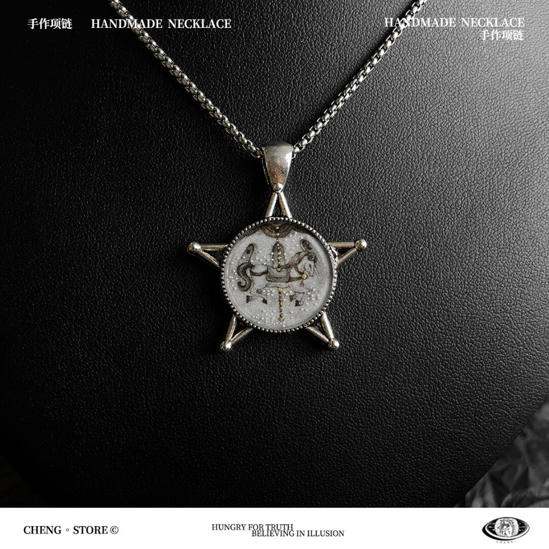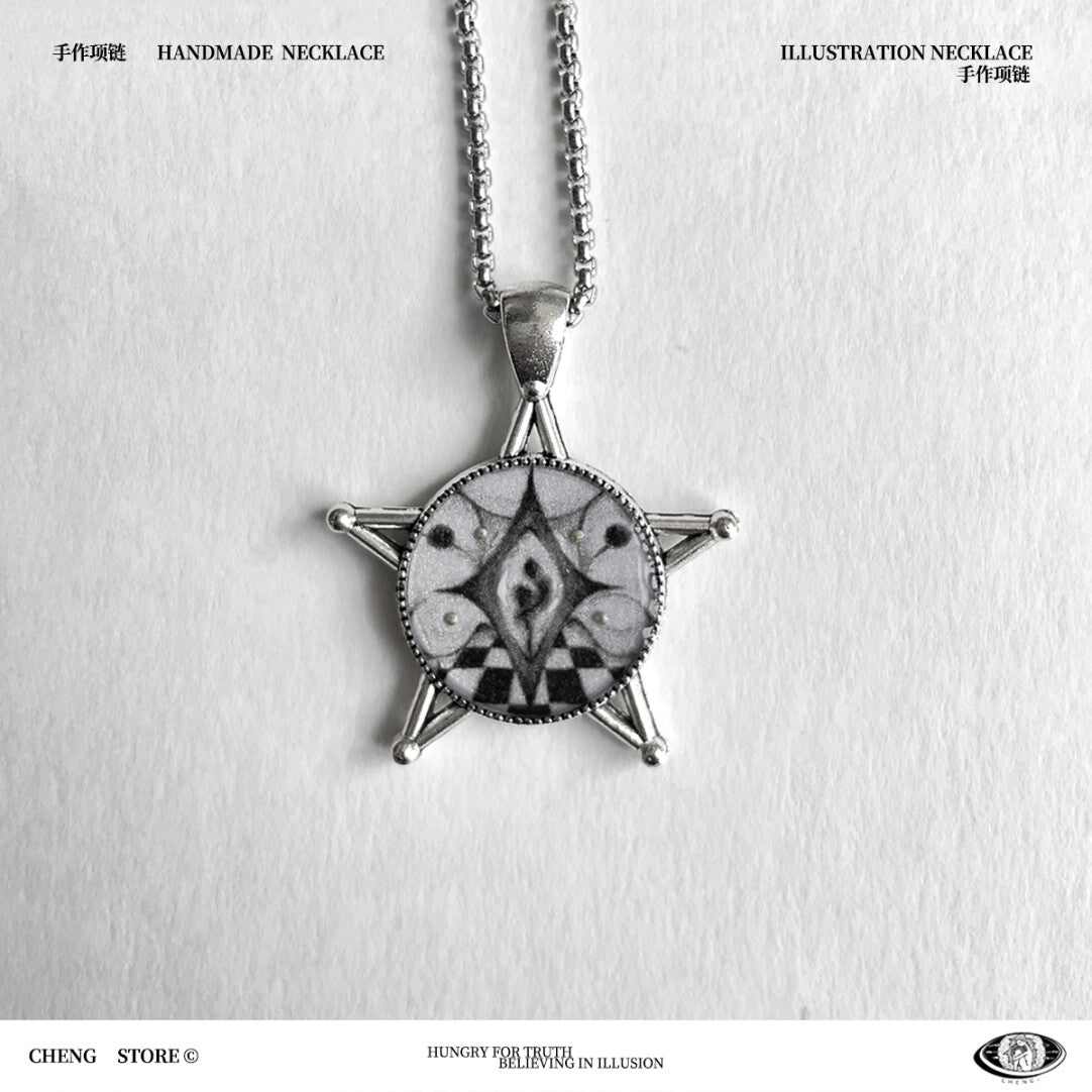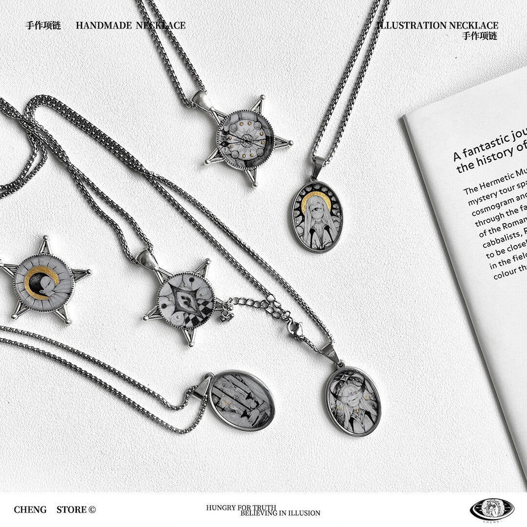 The Handmade Golden Age Necklace features a pendant illustrated by the artist herself, transforming original artwork into a striking piece of wearable art. Rich in creative expression, the design evokes a sense of timeless beauty and artistic freedom. Unique and expressive, this statement necklace is crafted for those who appreciate individuality, creativity, and art-inspired jewelry with a bold yet refined presence.
