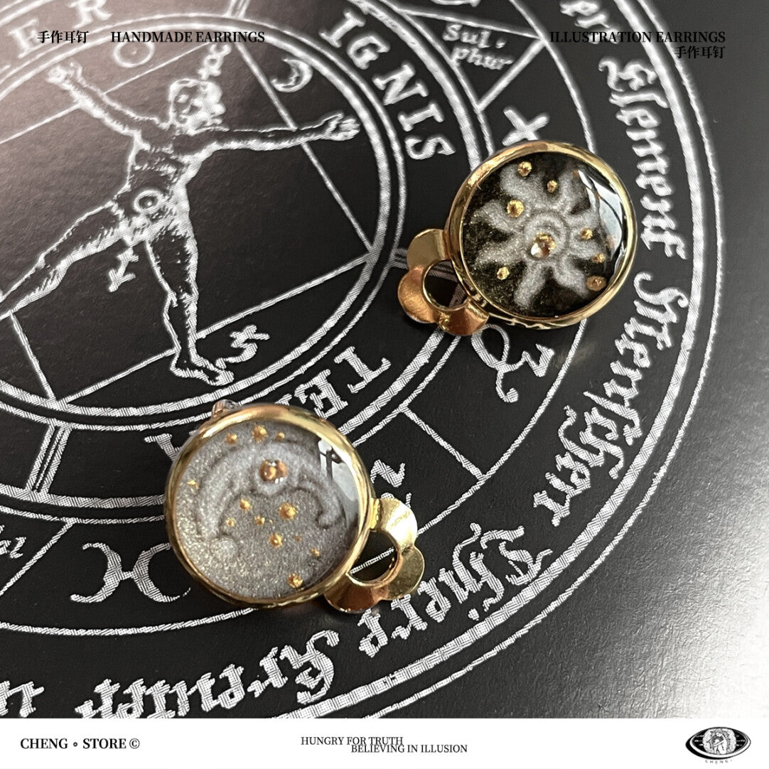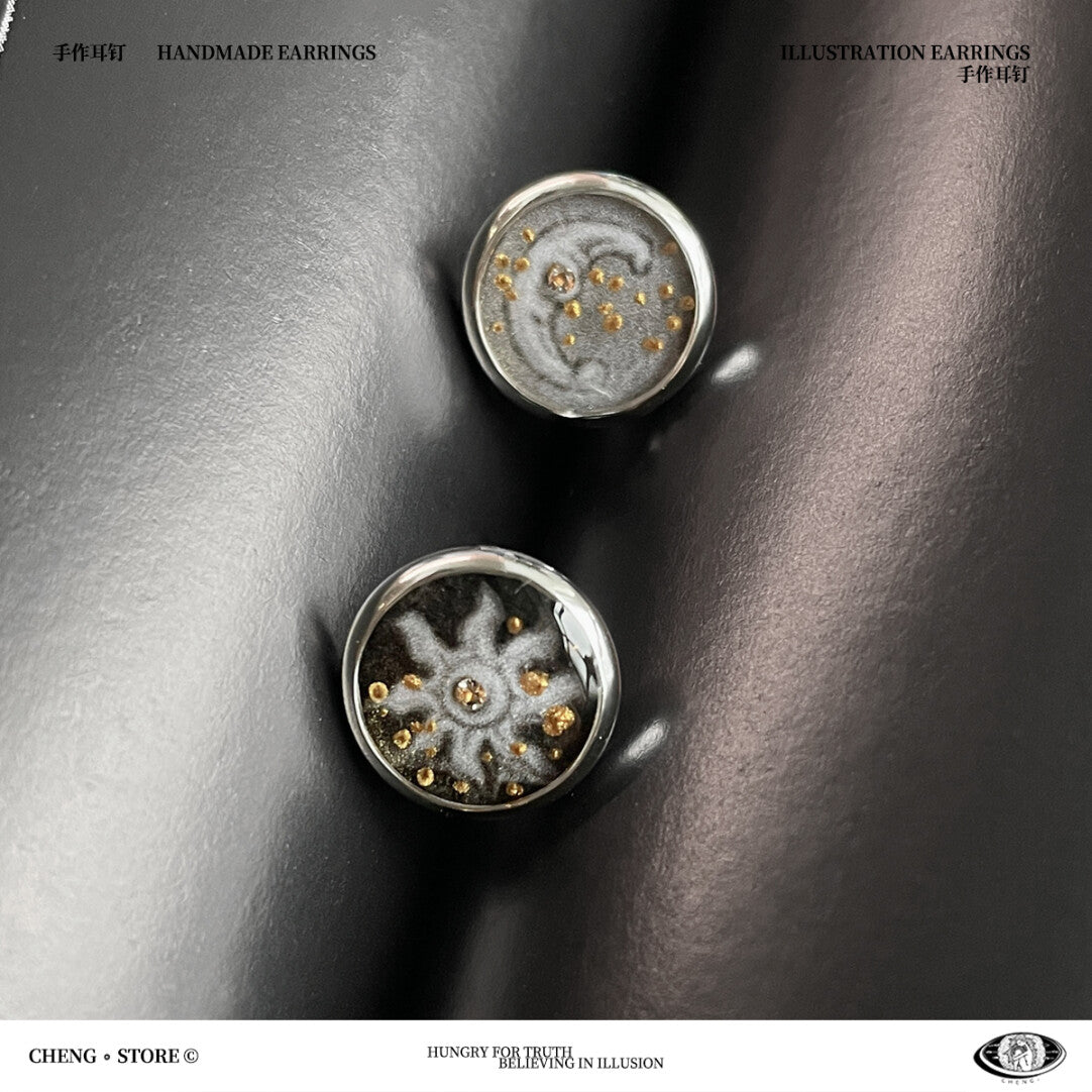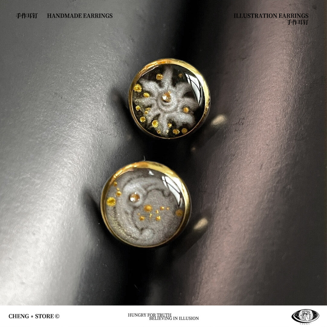 The Handmade Ink Painting Elements Earrings showcase wearable art through illustrations personally created by the artist. Each stud features a unique hand-drawn design, elevated with hand-painted gold details and finished in vacuum-plated gold for a refined glow. Bold yet elegant, these statement earrings blend artistic expression with craftsmanship, making every pair truly one of a kind. Perfect for those who value creativity, individuality, and art-inspired jewelry.