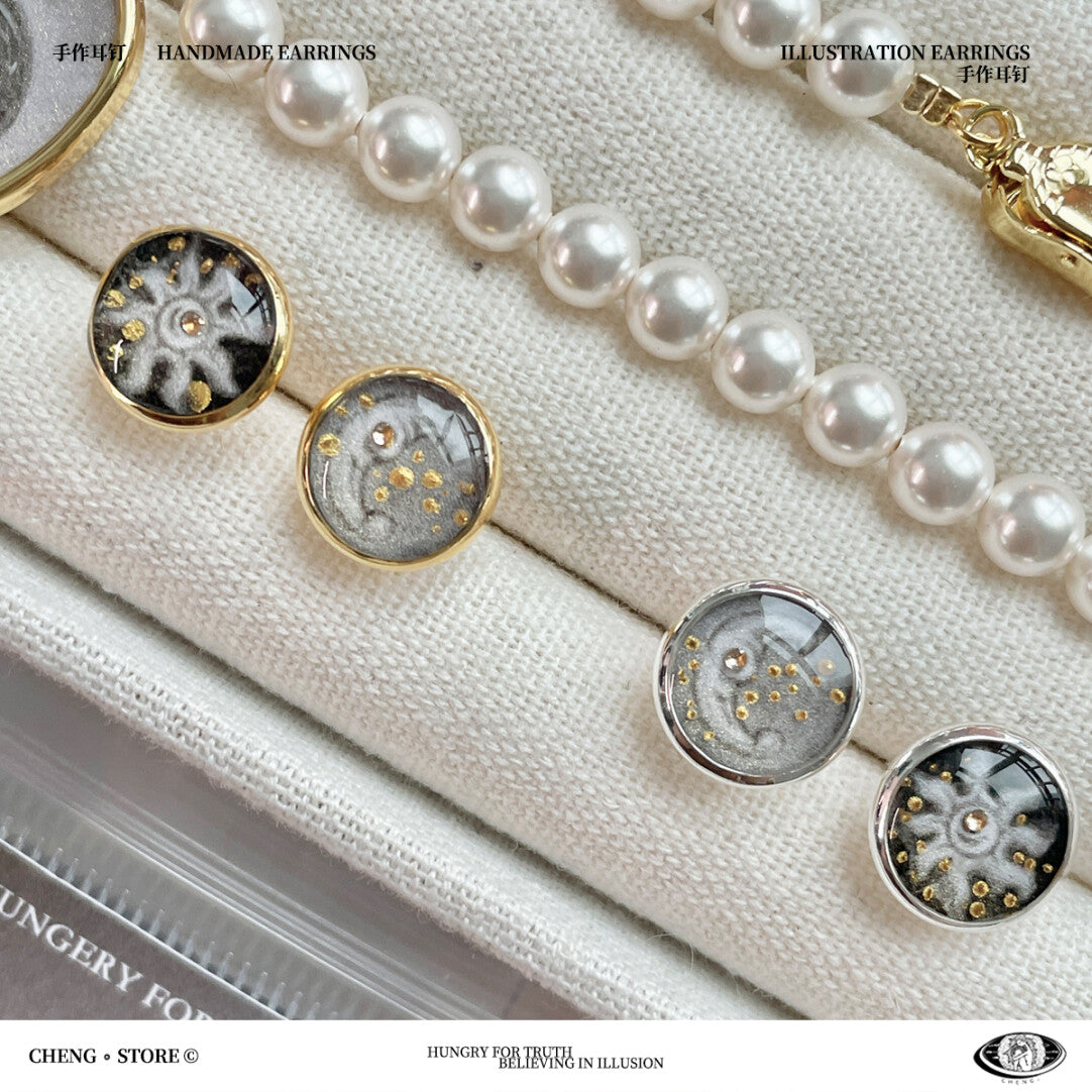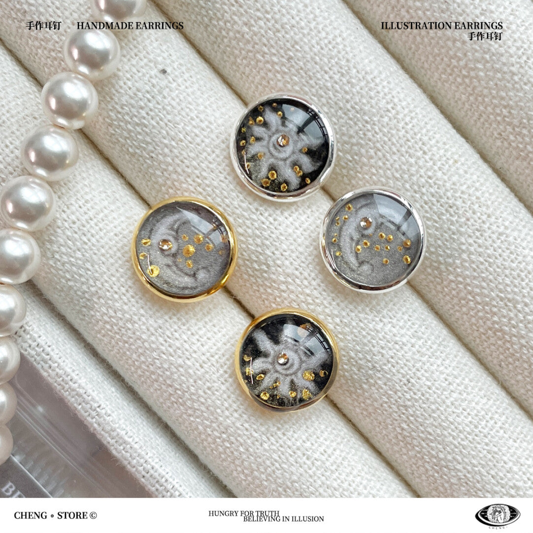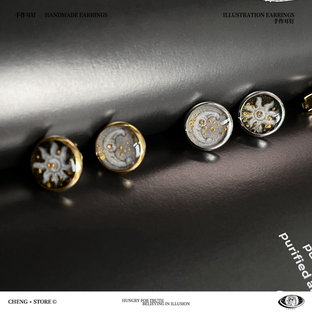 The Handmade Ink Painting Elements Earrings showcase wearable art through illustrations personally created by the artist. Each stud features a unique hand-drawn design, elevated with hand-painted gold details and finished in vacuum-plated gold for a refined glow. Bold yet elegant, these statement earrings blend artistic expression with craftsmanship, making every pair truly one of a kind. Perfect for those who value creativity, individuality, and art-inspired jewelry.