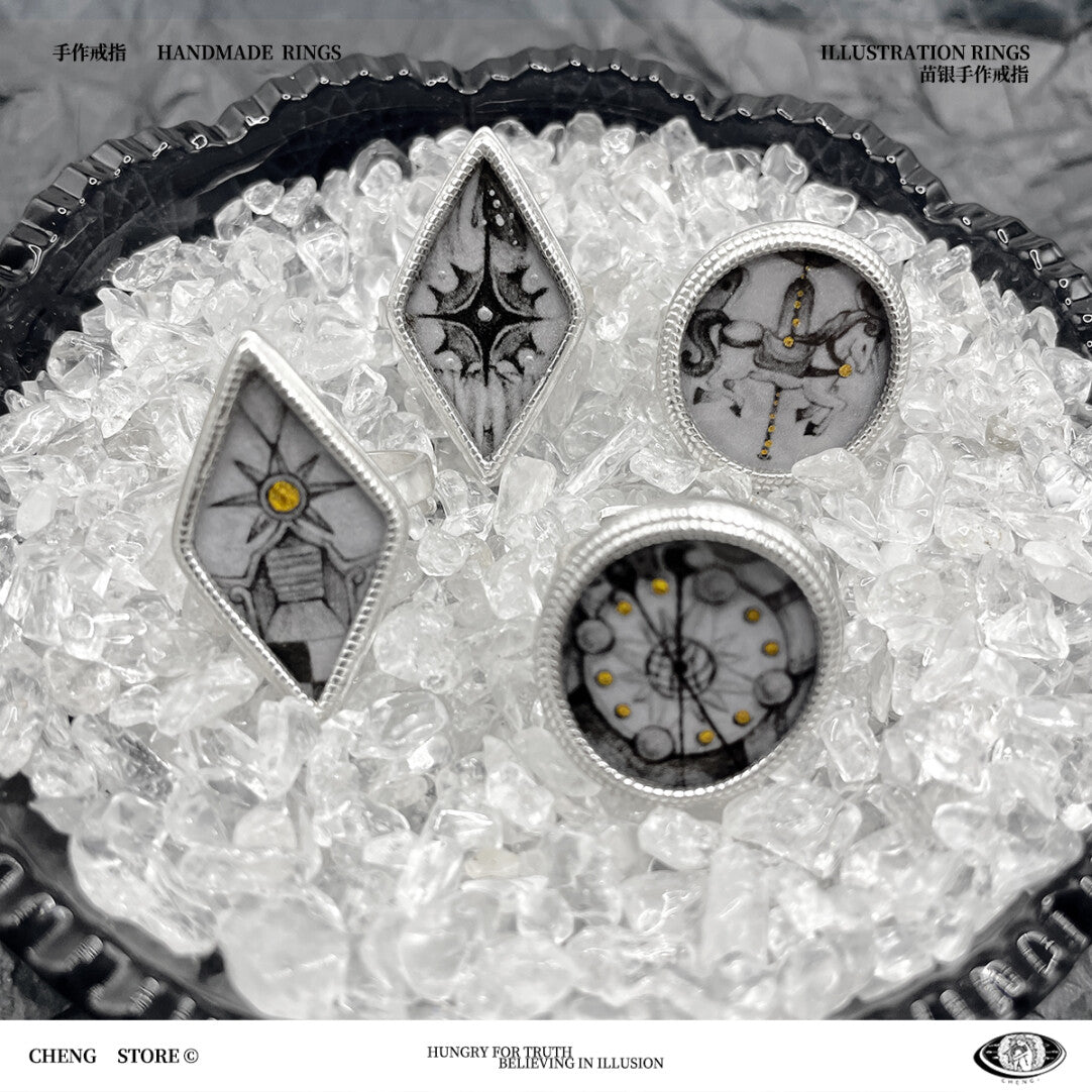The Handmade Ink Painting Elements Ring features a truly one-of-a-kind ring face, illustrated by the artist herself. Inspired by traditional ink painting and the vast universe, the artwork weaves together poetic elements such as the sun, moon, clouds, stars, and cosmic motifs, turning the ring into a miniature canvas. Artistic and expressive, this unique statement piece is designed for those who appreciate wearable art and creative individuality. Each ring carries its own story, making it a bold yet meaningful addition to any jewelry collection.