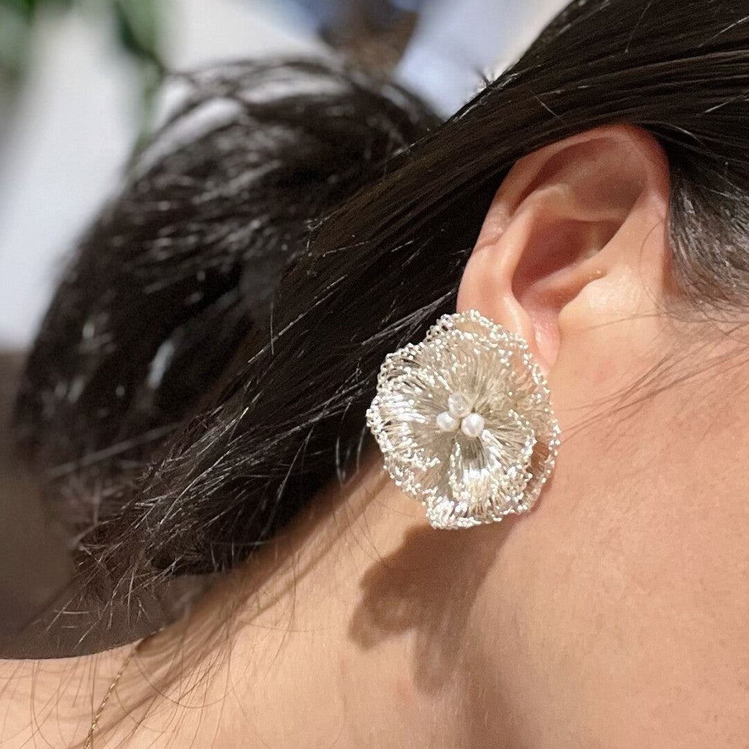 Elevate your everyday look with the exquisite Metal Woven Camellia Freshwater Pearl Earrings. These delicate ear studs are a celebration of artistry, where fine metal threads are skillfully shaped into the detailed petals of the classic Camellia flower. At the heart of each flower lies a luminous Freshwater Pearl Center, adding a touch of natural, timeless elegance. Camellias symbolize adoration and perfection, making these earrings a meaningful gift or a wonderful self-indulgence. They transition effortlessly from office wear to evening events, embodying understated luxury.