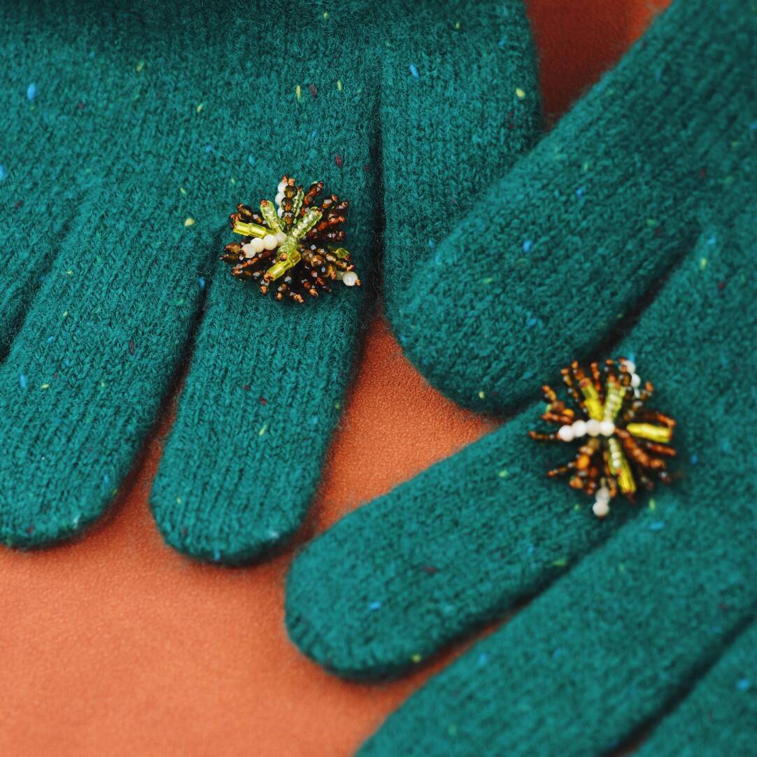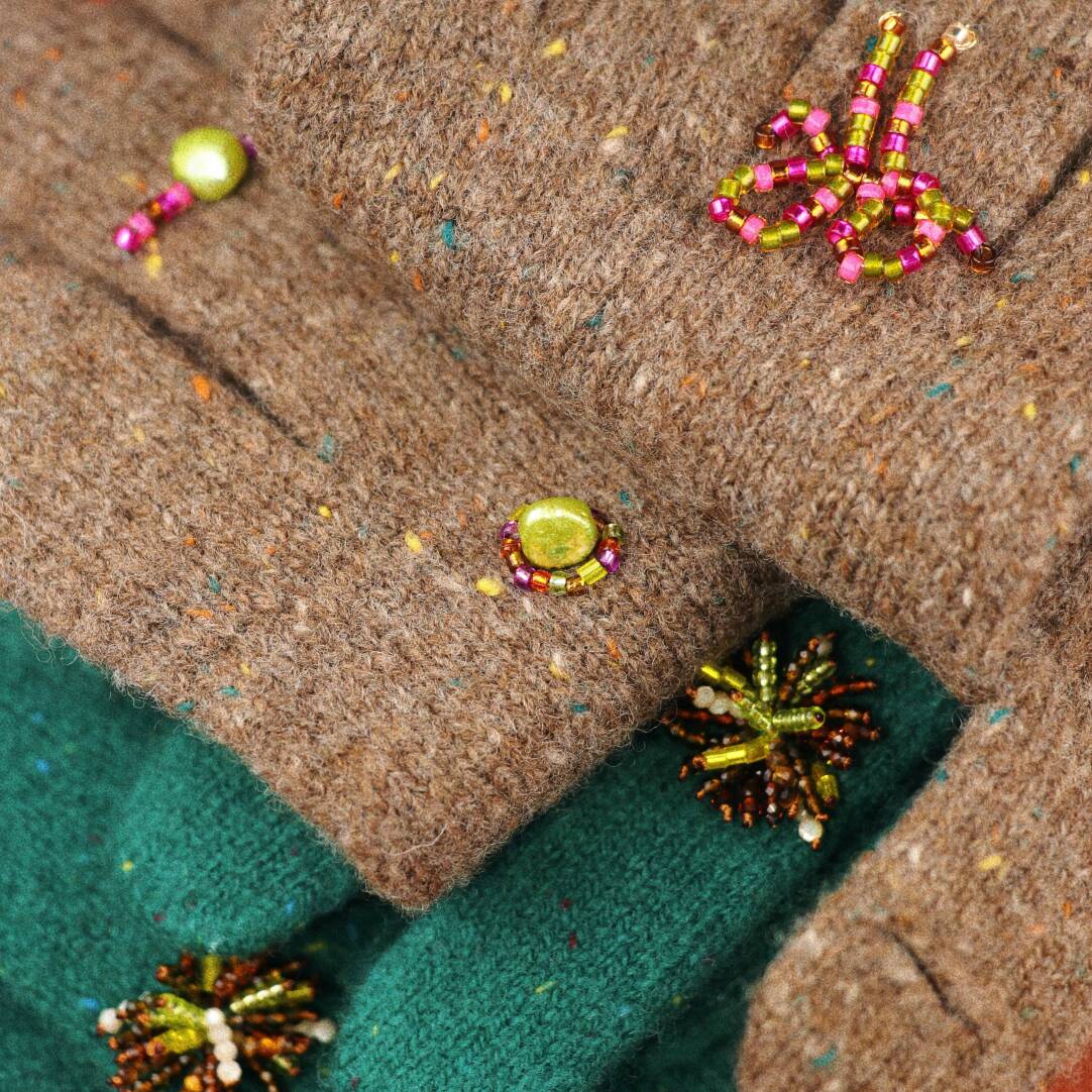 These cozy wool touchscreen gloves are adorned with a unique cluster on the index finger—a hand‑stitched arrangement of vintage shell pieces and polished tiger eye beads, forming a tactile, botanical‑inspired motif. Warm, functional, and artfully detailed, they blend winter comfort with artisanal charm. A thoughtful gift for pairs, carrying a whisper of nostalgia and natural elegance into the new year together.