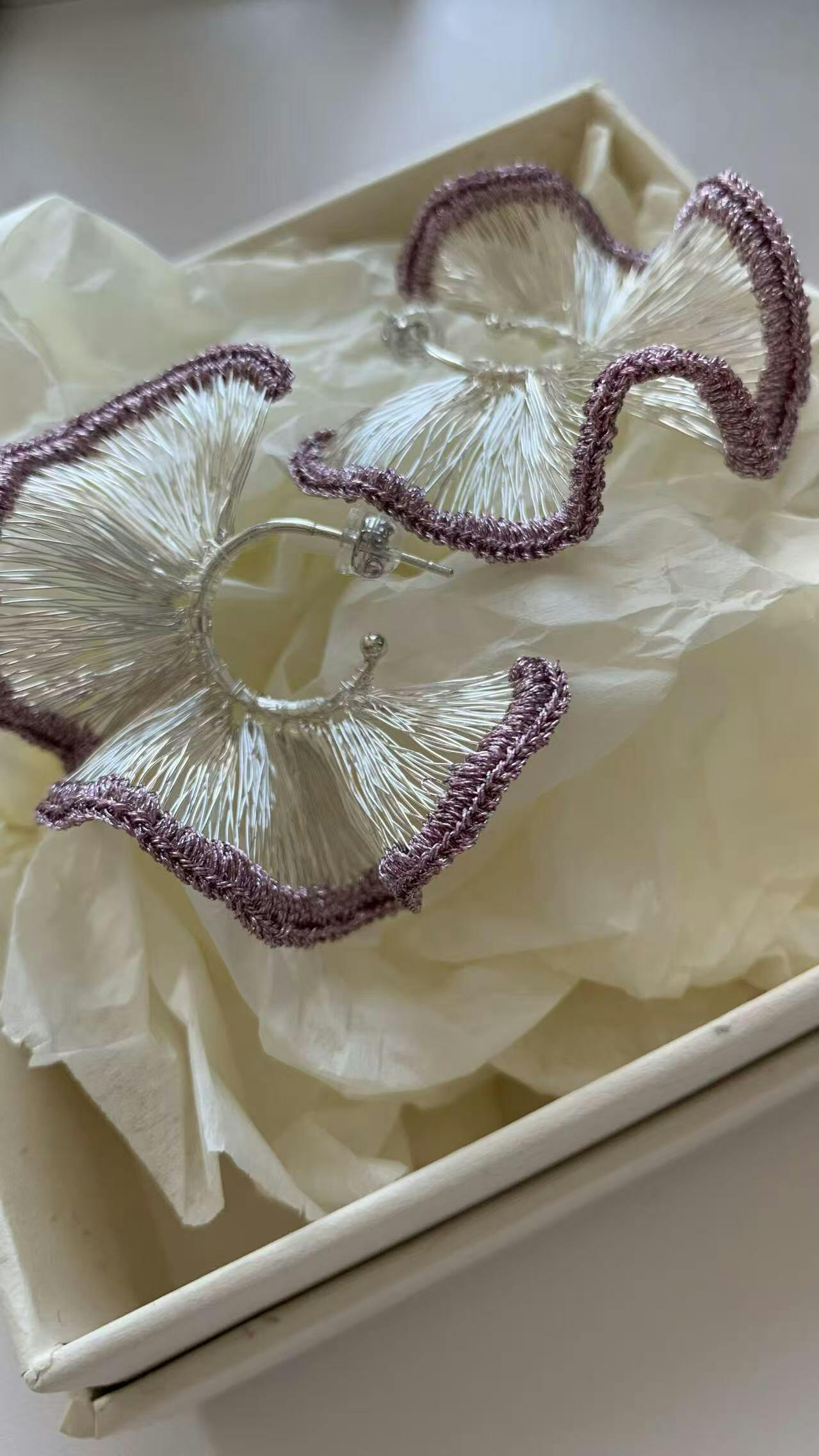 Presenting The Chromatic Bloom Collection, a series where artisan metal lace unfolds in a spectrum of curated hues. Each pair in this collection shares the same exquisite, hand-crocheted fan silhouette, yet tells a distinct color story—from sunlit warmth to twilight mystery. Choose the shade that resonates with your essence.
