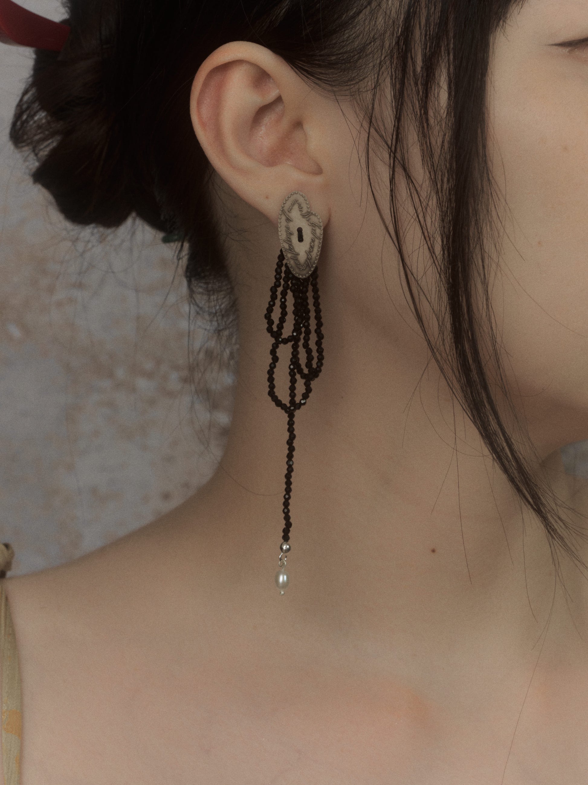 The Thoughts Obsidian Pearl Drop Earrings combine the deep, reflective beauty of obsidian with the soft glow of pearls, creating a refined contrast. Finished with a silver whitening technique, the metal details appear clean, bright, and elegantly balanced. Graceful in form and unique in character, these earrings offer timeless elegance with a modern edge—perfect for both everyday wear and special occasions.
