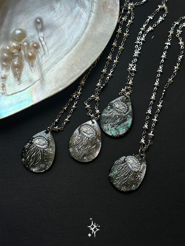 The Water Drop Starry Jellyfish Necklace features a graceful water-drop pendant crafted from luminous pearl oyster, detailed with a delicate jellyfish pattern that shimmers like starlight. Light-catching and poetic, it brings a dreamy ocean-inspired elegance to any look.Thoughtfully designed, this necklace makes a meaningful gift—perfect for celebrating love, imagination, and quiet beauty.